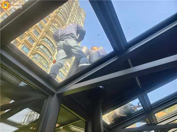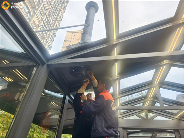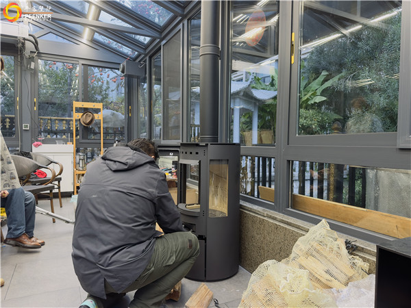 项目情况:该项目位于南京高淳区碧桂园别墅,安装在庭院阳光房中。对于阳光房的壁炉安装,烟囱通常是穿顶到户外,如果是玻璃顶,需要拆除原有玻璃顶,让玻璃厂家重新定制。在需要安装烟囱位置提前开洞后再做钢化处理。该项目由【平客壁炉】项目部带队上门安装。