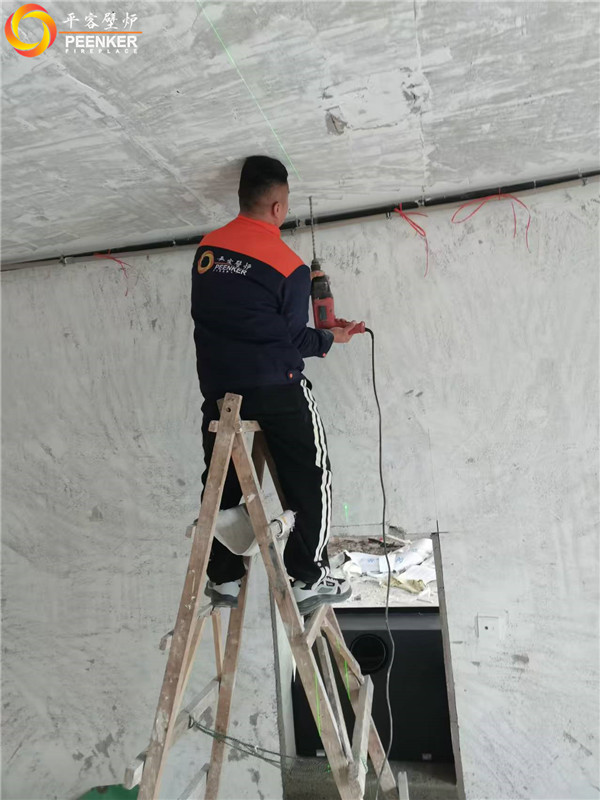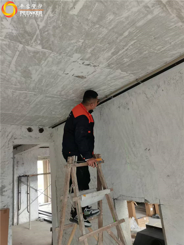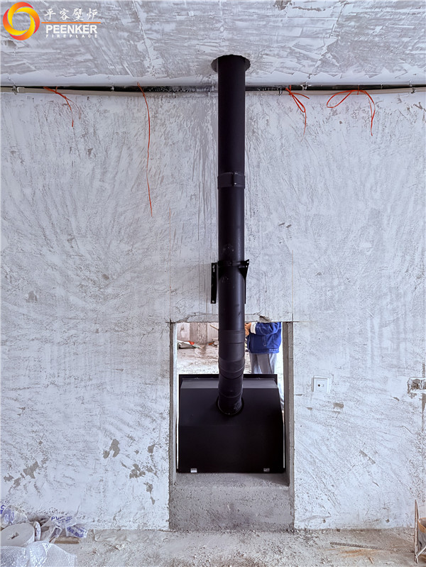 项目情况:该项目为三层独栋别墅,壁炉安装在一楼客厅中,烟囱直穿三层楼板到屋顶,由客户负责后续防水工作,平客壁炉项目部带队上门安装。