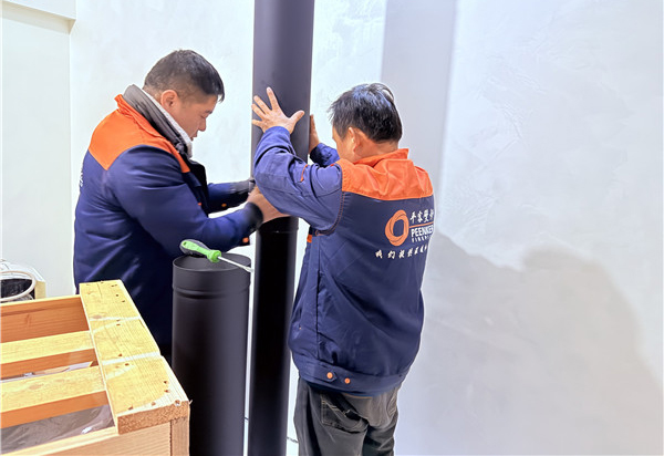 项目情况:该项目位于合肥市包河区,壁炉安装在地下室,烟囱穿天井出地面,由平客壁炉项目部带队上门安装。